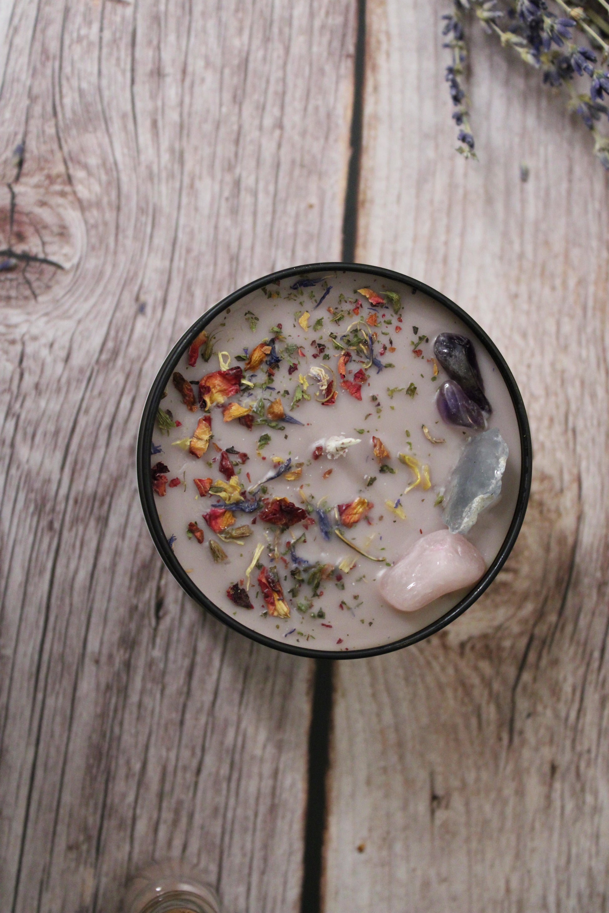 Scented of chamomile, lavender, sandalwood, vanilla, orange & clove, with inclusions of lavender, lemon balm, rose, calendula, celestite, amethyst and rose quartz.