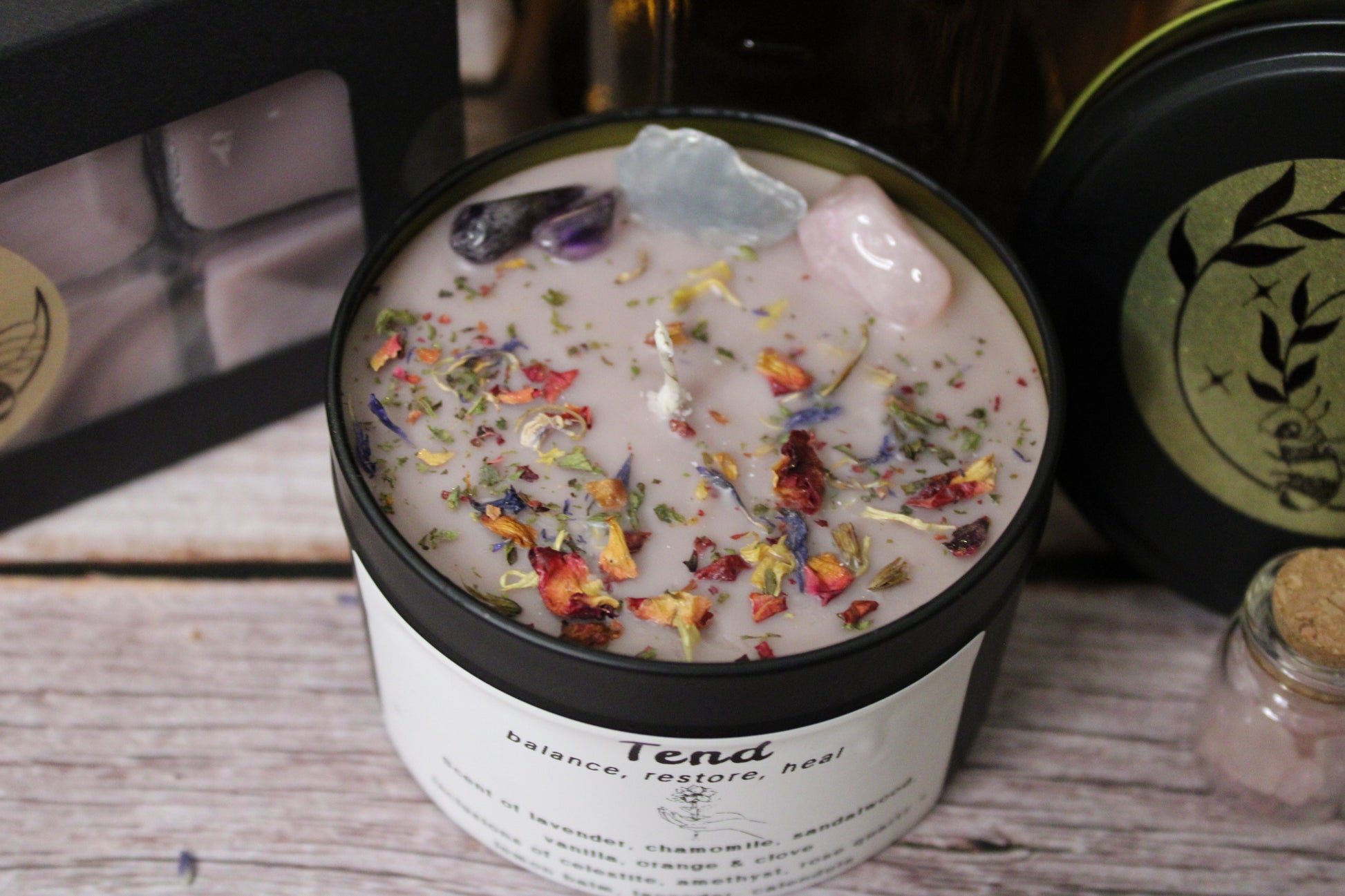 Take care of your mind, body and soul with Tend. A healing focused intention setting candle, crafted to foster gentleness, comfort, healing and growth. With this gentle scent and energies of rose quartz, celestite, and amethyst - you'll find a triad chosen to amplify self-love, peace and growth.